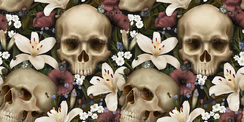 Древние цветочные безшивовые обои с черепами, лилиями, бабочками. Темный мистический ботанический фон. Роскошные узоры для оформления ткани, бумаги, обоев, холста. Ручная 3d иллюстрация