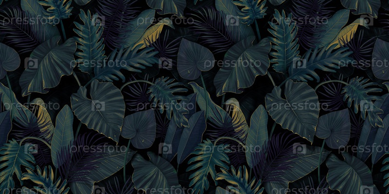 Ботаническая иллюстрация. Тропический бесшовный рисунок. Тропический лес, джунгли. Пальмовые листья, монстера, колоказия, банан. Ручной рисунок для оформления ткани, бумаги, обоев, обложек для ноутбуков
