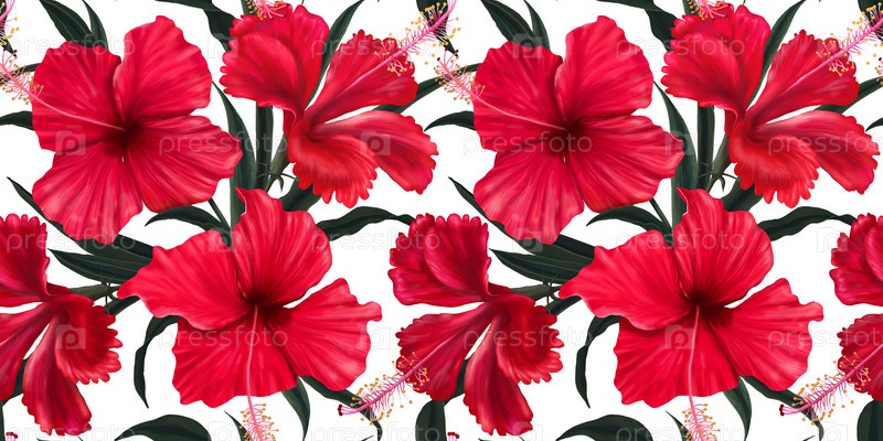 Красивые красные цветы гибискуса. Бесшовные тропические обои. Экзотический тропический узор. Ручная 3D-иллюстрация для ткани, обоев, бумаги