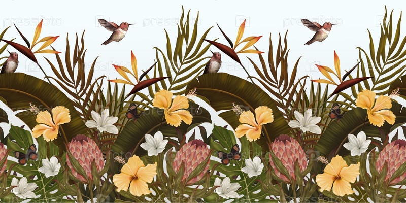 Винтажный тропический фон с протеей, цветами гибискуса, листьями, колибри, бабочками. Бесшовная граница. обои премиального класса. Ручной рисунок, 3d иллюстрация. Роскошная фреска для бумаги, упаковки, ткани