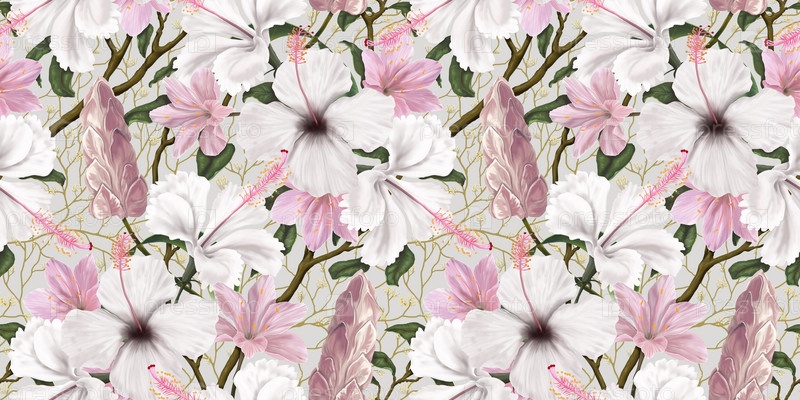 Бесшовный цветочный узор. Нежные ботанические обои с белыми и розовыми цветами. Светлый фон с цветущими ветвями, цветами гибискуса. Роскошный дизайн для обоев, бумаги, одежды, упаковки