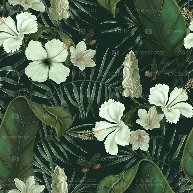 Тропический бесшовный узор с экзотическими цветами и листьями. Темный цветочный фон. Винтажный стиль. Ручная 3D-иллюстрация. Роскошный дизайн для обоев, тканей, росписи