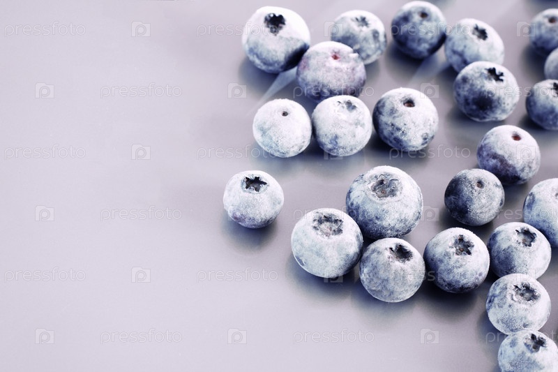 Замороженные ягоды черники крупным планом на сиреневом фоне. Ягоды в снегу