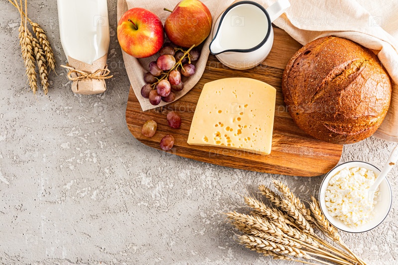Свежие молочные продукты, буханка хлеба, букет колосьев, яблоки для празднования еврейского Шавуота. вид сверху. пространство для копирования