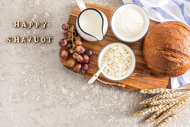 Весенний праздник евреев Шавуот. праздничная открытка с традиционной едой и кукурузными початками. деревянные буквы на сером фоне - счастливого шавуота