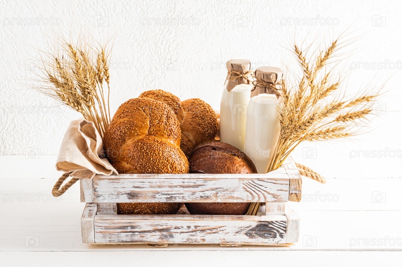Деревянная белая коробка, наполненная традиционными продуктами для праздника Шавуот. белый фон. передний план