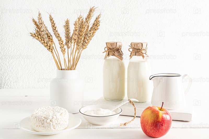 Вид спереди на две бутылки и кувшин с молоком, творогом, сметаной в мисках. ваза с колосьями. концепция праздника Шавуот