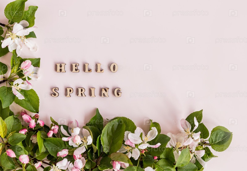Вид сверху на цветущие ветки яблони и деревянные буквы с текстом привет весна на розовом фоне. плоская кладка. рамка, открытка