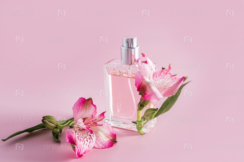 Прозрачная бутылка косметического продукта, парфюмированная вода или спрей крупным планом на розовом фоне с бутонами весенних цветов. реклама продукта