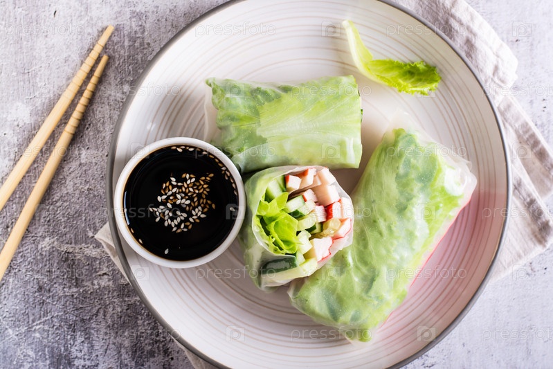 Свежие спринг-роллы с крабовыми палочками, огурцом и листьями салата. Вегетарианская еда. Вид сверху. Крупный план