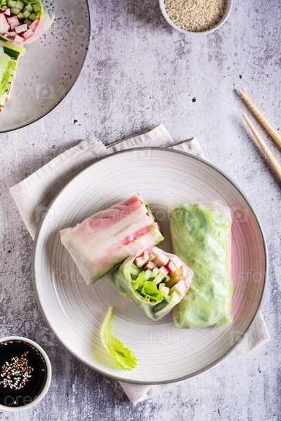 Свежие спринг-роллы с крабовыми палочками, огурцом и листьями салата. Вегетарианская еда. Вид сверху и вертикальный