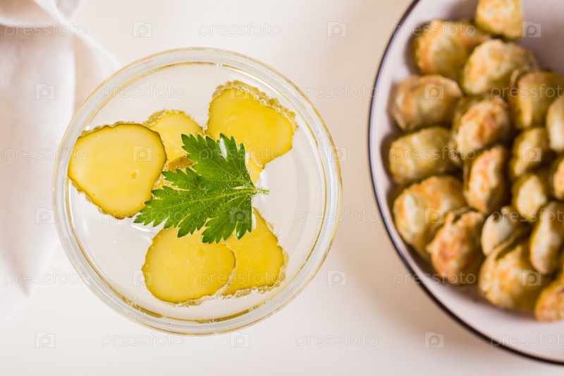 Коктейль с соленьями в стаканах на столе. Домашние напитки. Вид сверху. Крупный план