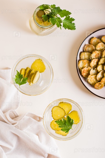 Холодный коктейль с маринованными огурцами и петрушкой в стаканах на столе. Верхний и вертикальный вид