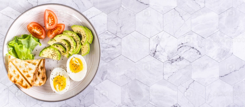 Авокадо, яйцо всмятку, помидоры, листья салата и тосты на тарелке. Здоровая пища. Вид сверху. Веб-баннер