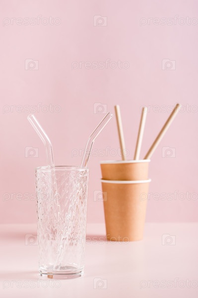 Многоразовые стеклянные стаканчики и соломинки против бумажных стаканчиков и соломинок. Ноль отходов. Вертикальный вид