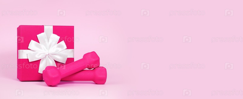 Розовые гантели возле подарочной коробки с бантом на розовом фоне. Концепция скидки, подарка или сюрприза для фитнеса, домашних тренировок, активного отдыха и спорта, здорового образа жизни. Женское здоровье. Баннер