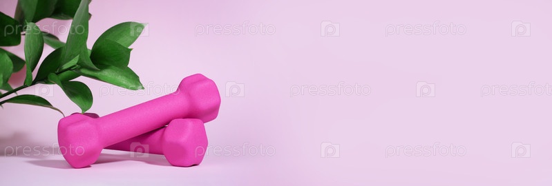Розовые гантели изолированы на розовом фоне с жесткими тенями и листьями. Концепция фитнеса, домашних тренировок, активности и спорта, здорового образа жизни. Женское здоровье. Баннер. Копировать пространство