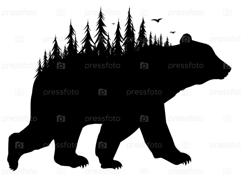 Силуэт дикого медведя с лесом и птицей