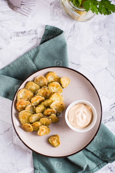 Закуска из жареных солений и соус в миске на тарелке. Домашняя закуска. Верхний и вертикальный вид