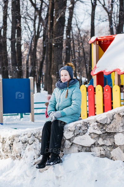 Улыбающаяся девушка в зимней одежде сидит зимой на детской площадке в парке. Прогулки на свежем воздухе