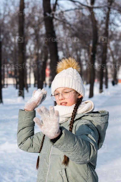 Девушка в теплой одежде хочет бросить снежок в зимнем парке. Игры на открытом воздухе