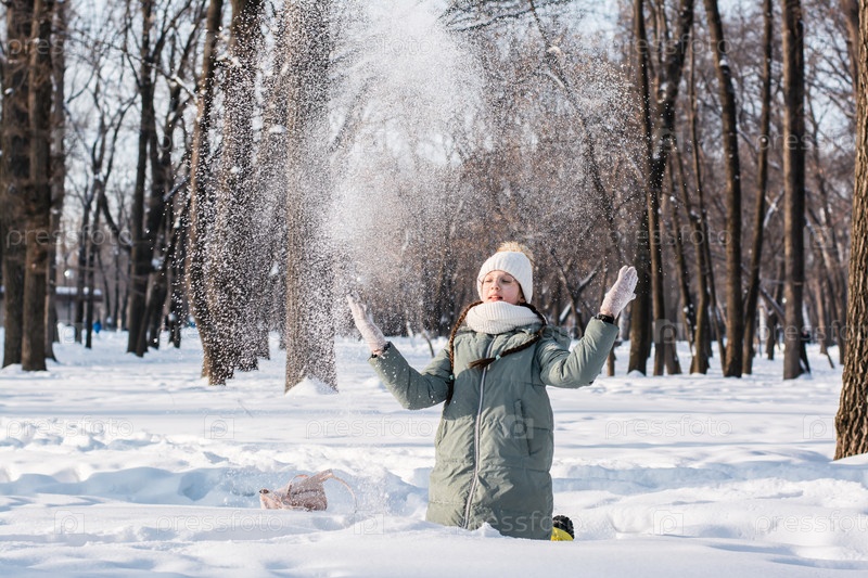 Девушка в очках и теплой одежде бросает снег в зимнем лесу. Велнес