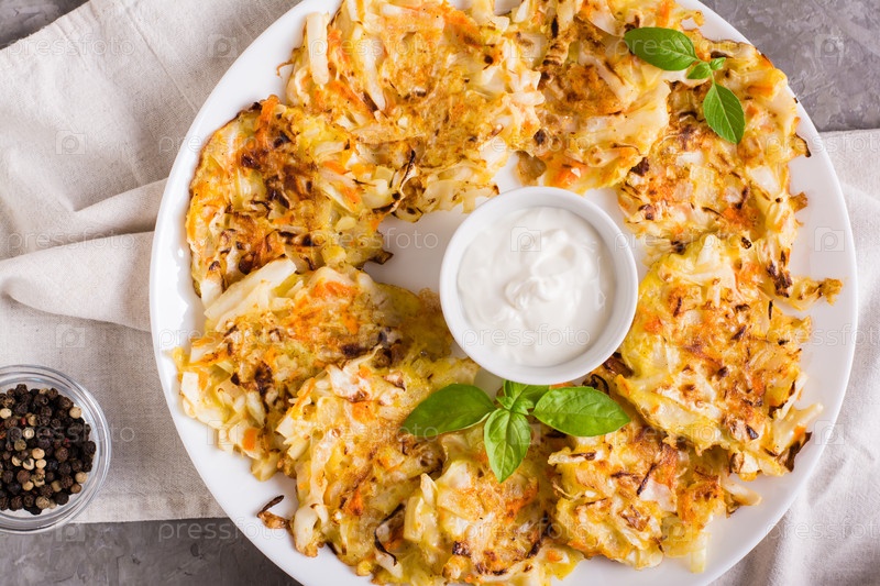 Овощные оладьи из капусты и моркови и соус на тарелке. Вегетарианская еда. Вид сверху. Крупный план