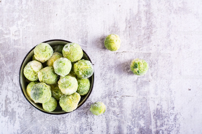Замороженная брюссельская капуста в миске на сером фоне. Вегетарианская еда. Вид сверху