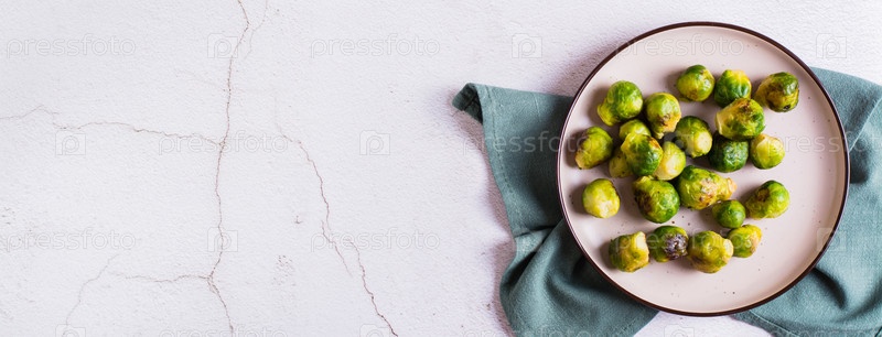 Домашняя жареная брюссельская капуста на тарелке и соус в миске на столе. Вид сверху. Веб-баннер