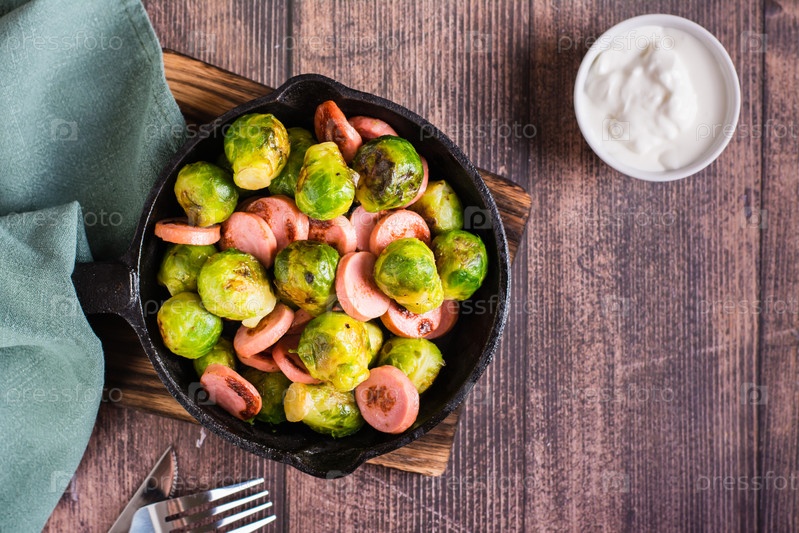 Жареная брюссельская капуста с сосисками в сковороде на столе. Домашний ужин. Вид сверху