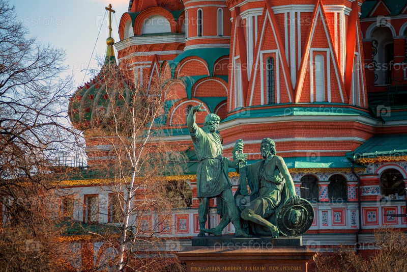 Памятник Минину и Пожарскому у собора Василия Блаженного в Москве, Россия. Храм Старого Василия Блаженного является визитной карточкой Москвы. Известная архитектура в центре Москвы. Концепция истории и культуры