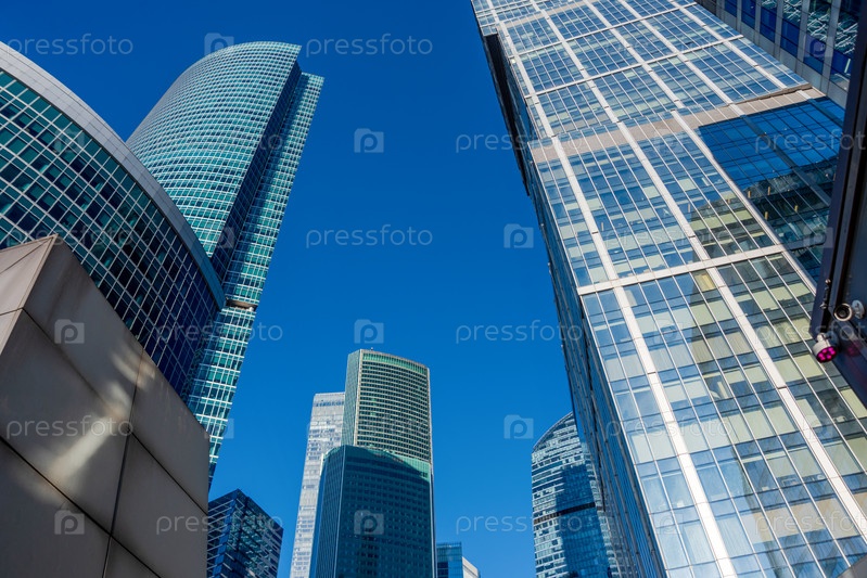 МОСКВА, РОССИЯ - 02 февраля 2021 г.: Москва в солнечный зимний день. Деловой район Москвы в синих тонах зимних огней. Солнечный день в большом городе