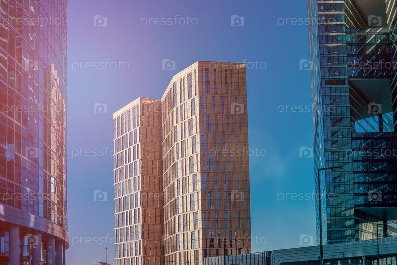 МОСКВА, РОССИЯ - 02 февраля 2021 г.: Москва в солнечный зимний день. Деловой район Москвы в синих тонах зимних огней. Солнечный день в большом городе