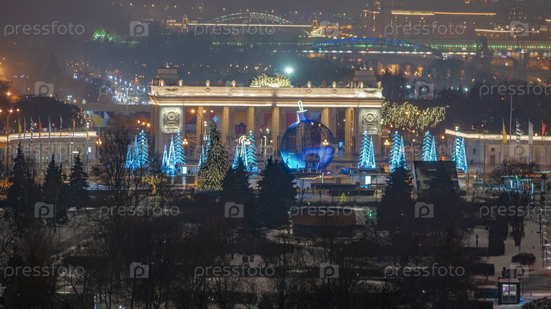 МОСКВА - 31 декабря 2020 г.: Ворота парка Горького ночью в Москве, Россия. Это центральный московский парк, расположенный в самом центре города