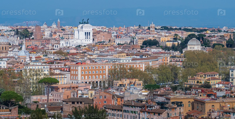 Рим (Италия) - Вид на город с холма Яникул и террасы, с Витториано, церковью Тринита-деи-Монти и дворцом Квиринале
