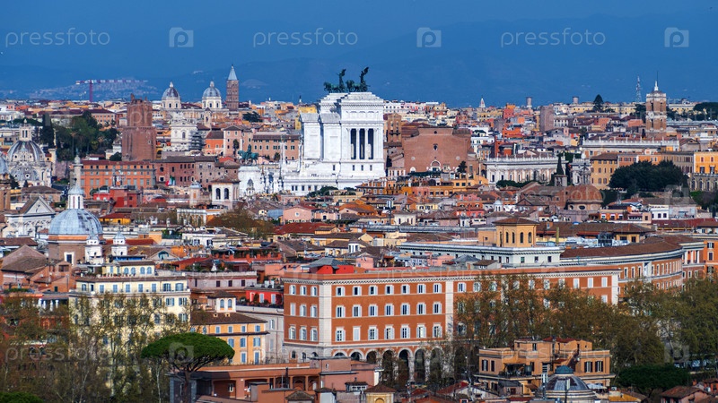 Рим (Италия) - Вид на город с холма Яникул и террасы, с Витториано, церковью Тринита-деи-Монти и дворцом Квиринале