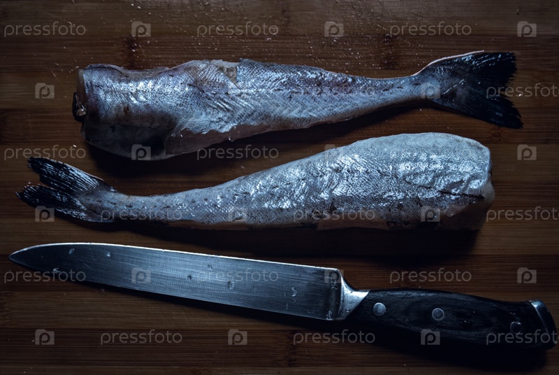 Свежий минтай из белой рыбы на разделочной доске с ножом
