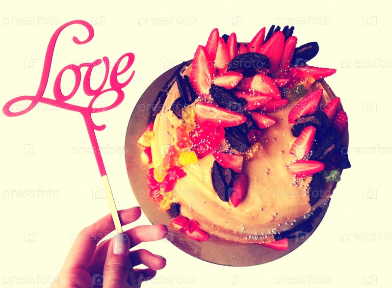 Плоский торт с клубникой, бисквитом и желейными шариками