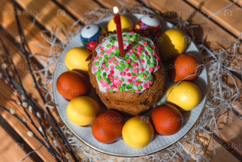 Керамическая тарелка с куличом, зажженной свечой и крашеными яйцами на деревянном столе с ветвями ивы