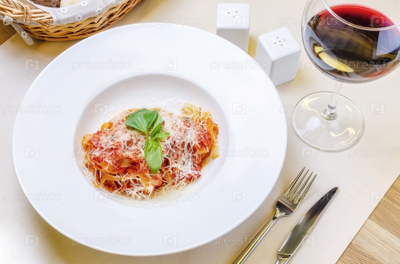Итальянская паста с помидорами, сыром и веточкой базилика