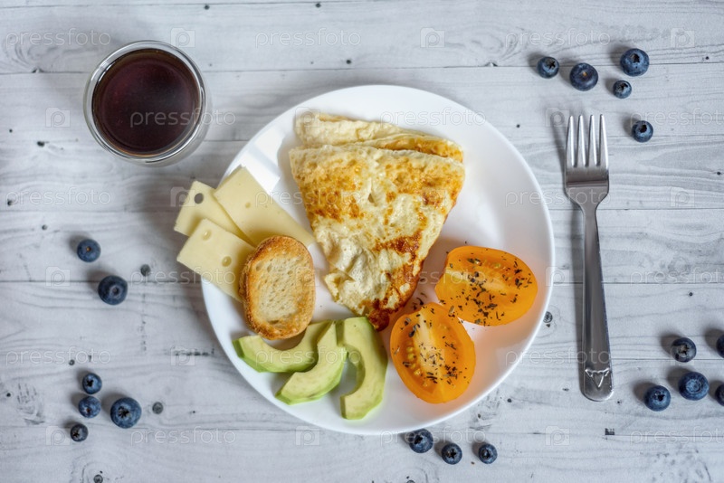 Омлет с сыром авокадо и багетом, тост на тарелке