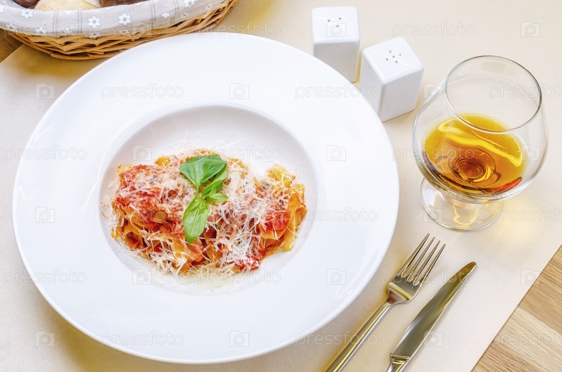 Итальянская паста с помидорами, сыром и веточкой базилика