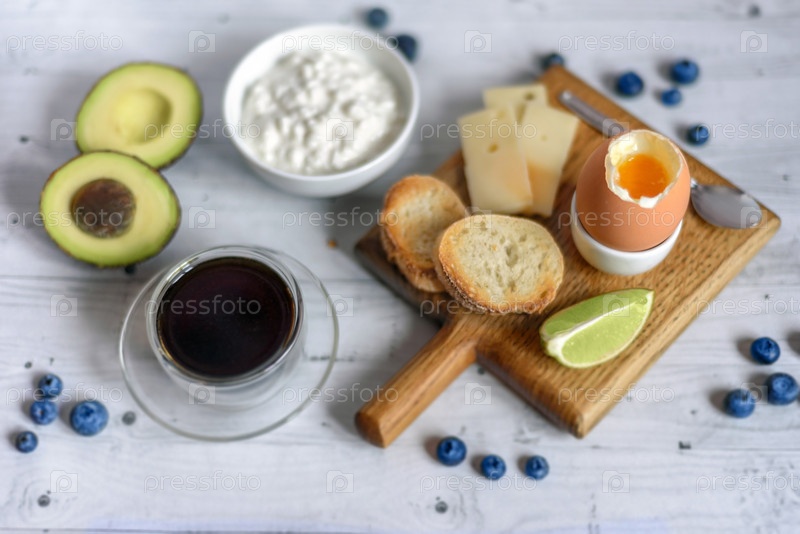 Полезный и питательный завтрак: тарелка творога, твердого сыра, вареное яйцо, ломтики багета с авокадо и чашка горячего кофе или чая