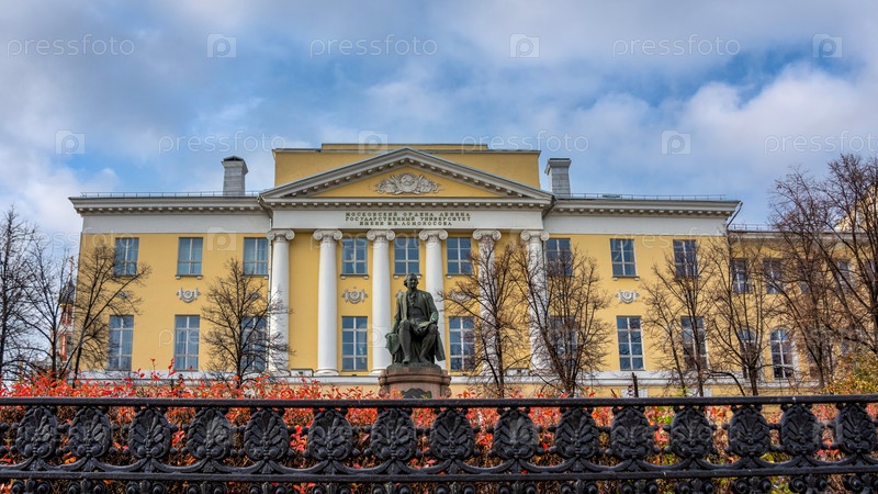 Россия, Москва - 21 октября 2021 года: Здание Московского государственного университета имени Михаила Ломоносова в центре Москвы. Перед ним памятник Михаилу Ломоносову