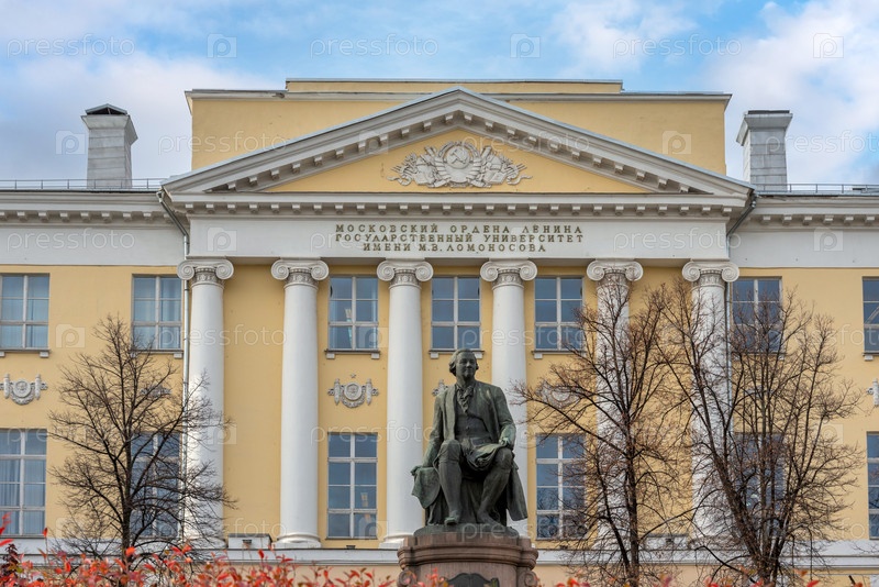 Россия, Москва - 21 октября 2021 года: Здание Московского государственного университета имени Михаила Ломоносова в центре Москвы. Перед ним памятник Михаилу Ломоносову