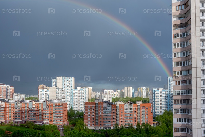 Москва, Россия - 16 мая 2020 г.: Радуга в небе после весеннего дождя над многоэтажными домами жилого района города. жилой район Раменки