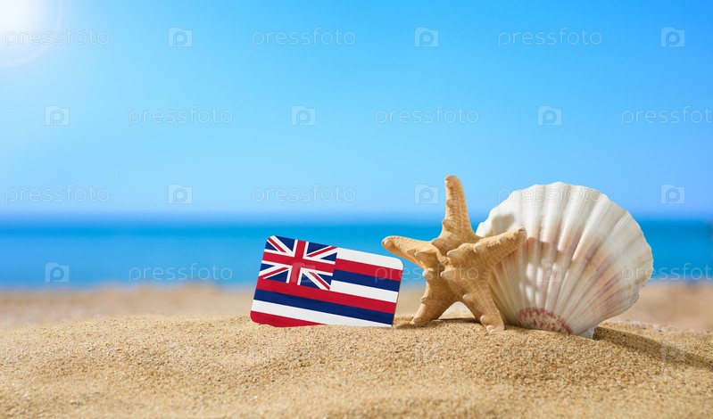 Тропический пляж с ракушками и флагом Гавайев. Концепция райского отдыха на пляжах Гавайев