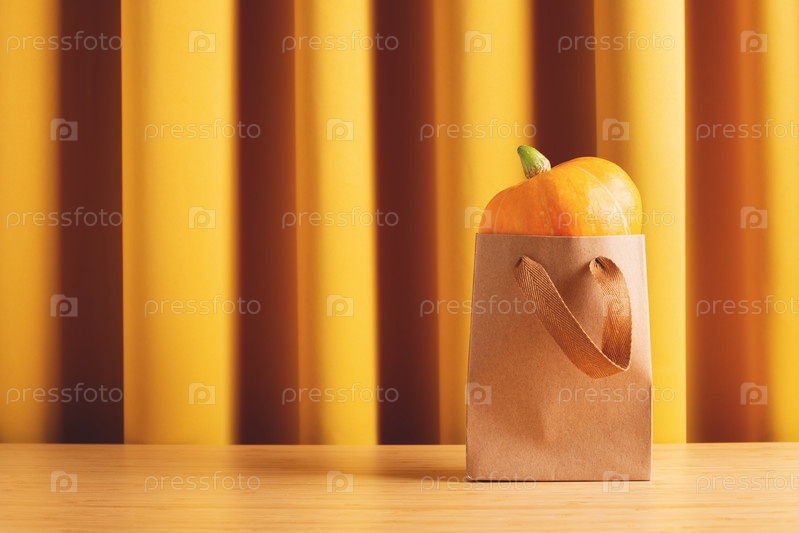 Осенний фон с желтой тыквой в сумке на фоне желтых штор
