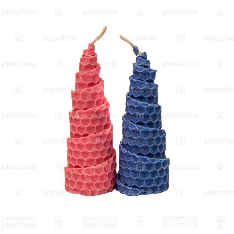 Красные и синие самодельные свечи с сотами в форме башни, изолированные на белом фоне
