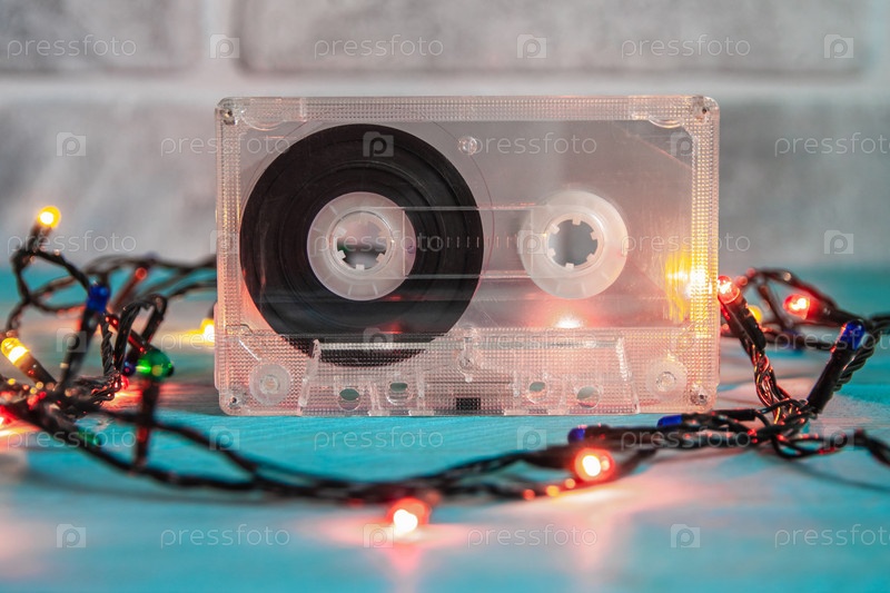 Слегка потертая аудиокассета в прозрачном пластиковом футляре стоит на синем фоне в окружении разноцветных гирлянд